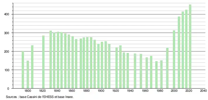 L'évolution du nombre d'habitants est connue à travers les recensements de la population effectués dans la commune depuis 1793. Pour les communes de moins de 10 000 habitants, une enquête de recensement portant sur toute la population est réalisée tous les cinq ans, les populations légales des années intermédiaires étant quant à elles estimées par interpolation ou extrapolation[25]. Pour la commune, le premier recensement exhaustif entrant dans le cadre du nouveau dispositif a été réalisé en 2006[26].