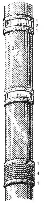 Les gros mâts sont les plus composés[4]; les pièces étant réunies, on arrondit les mâts et on en maintient définitivement l'assemblage avec des cerclages chassés à chaud[1]. L'assemblage des vergues principales est, ainsi que celui des mâts, contenu par des cercles de fer qui les ceignent à 3 pieds de distance les uns des autres sur toute la longueur d'un mât, depuis les jottereaux jusqu'au pied, et d'un capelage de vergue à l'autre[4].