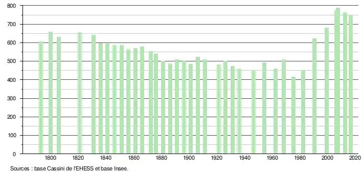L'évolution du nombre d'habitants est connue à travers les recensements de la population effectués dans la commune depuis 1793. Pour les communes de moins de 10 000 habitants, une enquête de recensement portant sur toute la population est réalisée tous les cinq ans, les populations légales des années intermédiaires étant quant à elles estimées par interpolation ou extrapolation[7]. Pour la commune, le premier recensement exhaustif entrant dans le cadre du nouveau dispositif a été réalisé en 2007[8].