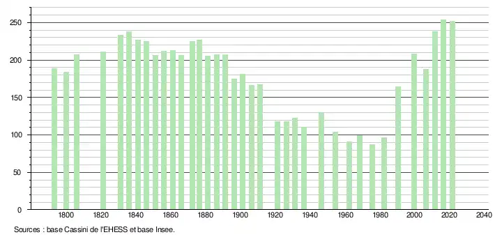 L'évolution du nombre d'habitants est connue à travers les recensements de la population effectués dans la commune depuis 1793. Pour les communes de moins de 10 000 habitants, une enquête de recensement portant sur toute la population est réalisée tous les cinq ans, les populations légales des années intermédiaires étant quant à elles estimées par interpolation ou extrapolation[29]. Pour la commune, le premier recensement exhaustif entrant dans le cadre du nouveau dispositif a été réalisé en 2006[30].