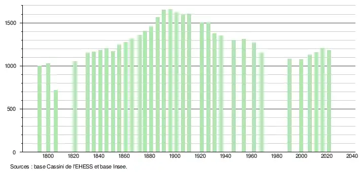 L'évolution du nombre d'habitants est connue à travers les recensements de la population effectués dans la commune depuis 1793. Pour les communes de moins de 10 000 habitants, une enquête de recensement portant sur toute la population est réalisée tous les cinq ans, les populations légales des années intermédiaires étant quant à elles estimées par interpolation ou extrapolation[26]. Pour la commune, le premier recensement exhaustif entrant dans le cadre du nouveau dispositif a été réalisé en 2006[27].