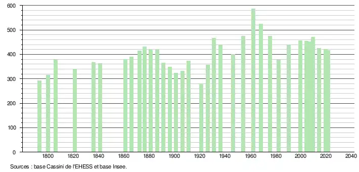 L'évolution du nombre d'habitants est connue à travers les recensements de la population effectués dans la commune depuis 1793. Pour les communes de moins de 10 000 habitants, une enquête de recensement portant sur toute la population est réalisée tous les cinq ans, les populations légales des années intermédiaires étant quant à elles estimées par interpolation ou extrapolation[16]. Pour la commune, le premier recensement exhaustif entrant dans le cadre du nouveau dispositif a été réalisé en 2004[17].