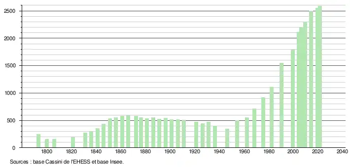 L'évolution du nombre d'habitants est connue à travers les recensements de la population effectués dans la commune depuis 1793. Pour les communes de moins de 10 000 habitants, une enquête de recensement portant sur toute la population est réalisée tous les cinq ans, les populations légales des années intermédiaires étant quant à elles estimées par interpolation ou extrapolation[28]. Pour la commune, le premier recensement exhaustif entrant dans le cadre du nouveau dispositif a été réalisé en 2004[29].