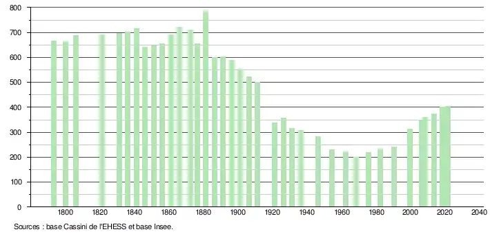 L'évolution du nombre d'habitants est connue à travers les recensements de la population effectués dans la commune depuis 1793. Pour les communes de moins de 10 000 habitants, une enquête de recensement portant sur toute la population est réalisée tous les cinq ans, les populations légales des années intermédiaires étant quant à elles estimées par interpolation ou extrapolation[26]. Pour la commune, le premier recensement exhaustif entrant dans le cadre du nouveau dispositif a été réalisé en 2008[27].