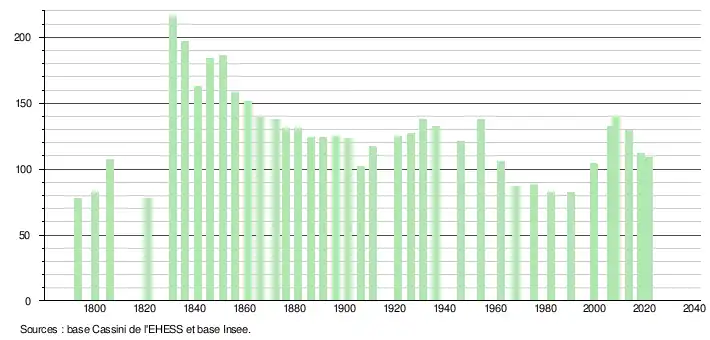 L'évolution du nombre d'habitants est connue à travers les recensements de la population effectués dans la commune depuis 1793. Pour les communes de moins de 10 000 habitants, une enquête de recensement portant sur toute la population est réalisée tous les cinq ans, les populations légales des années intermédiaires étant quant à elles estimées par interpolation ou extrapolation[20]. Pour la commune, le premier recensement exhaustif entrant dans le cadre du nouveau dispositif a été réalisé en 2008[21].