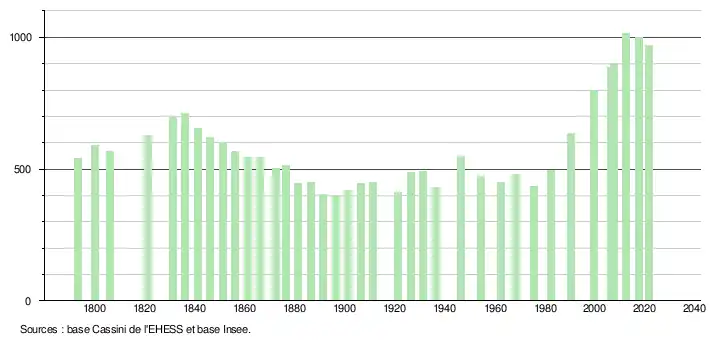 L'évolution du nombre d'habitants est connue à travers les recensements de la population effectués dans la commune depuis 1793. Pour les communes de moins de 10 000 habitants, une enquête de recensement portant sur toute la population est réalisée tous les cinq ans, les populations légales des années intermédiaires étant quant à elles estimées par interpolation ou extrapolation[32]. Pour la commune, le premier recensement exhaustif entrant dans le cadre du nouveau dispositif a été réalisé en 2007[33].