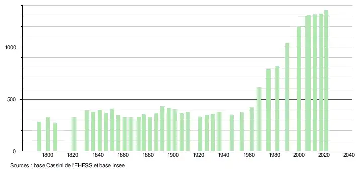 L'évolution du nombre d'habitants est connue à travers les recensements de la population effectués dans la commune depuis 1793. Pour les communes de moins de 10 000 habitants, une enquête de recensement portant sur toute la population est réalisée tous les cinq ans, les populations légales des années intermédiaires étant quant à elles estimées par interpolation ou extrapolation[30]. Pour la commune, le premier recensement exhaustif entrant dans le cadre du nouveau dispositif a été réalisé en 2007[31].