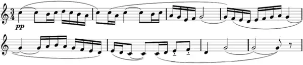 - Le motif secondaire sous-tend le principal dont il est une réplique simplifiée : {noire, noire, noire} dans la première mesure, {noire, noire, croche-croche} dans la seconde. Il est donné dès la première mesure par les pizzicati des altos et des violoncelles. Il est intimement lié à la mélodie, affirmant la tonalité d’ut majeur durant tout le morceau en faisant correspondre le premier temps à la tonique do et les deuxième et troisième temps à la dominante sol. Confié principalement aux cordes, il est progressivement amplifié, avec un renforcement harmonique par d'autres instruments sur les deuxième et troisième temps à partir de la section [2] (39e mesure).