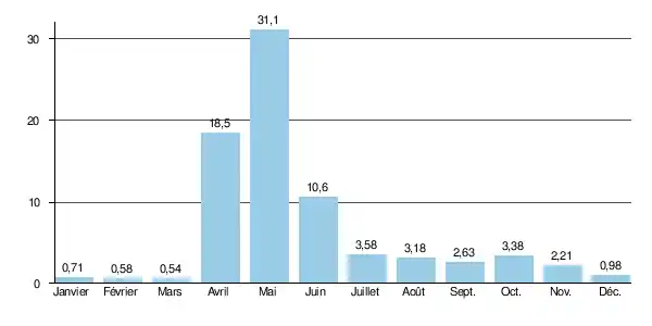 En ce qui concerne la période libre de glaces (de mai à octobre inclus), le débit mensuel minimal observé a été de 0,38 m3/s en , ce qui montre que les étiages d'été-automne peuvent se révéler assez sévères dans la région.