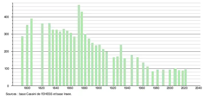 L'évolution du nombre d'habitants est connue à travers les recensements de la population effectués dans la commune depuis 1793. Pour les communes de moins de 10 000 habitants, une enquête de recensement portant sur toute la population est réalisée tous les cinq ans, les populations légales des années intermédiaires étant quant à elles estimées par interpolation ou extrapolation[18]. Pour la commune, le premier recensement exhaustif entrant dans le cadre du nouveau dispositif a été réalisé en 2007[19].