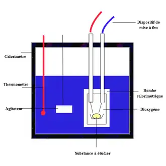 Le principe de fonctionnement de la bombe calorimétrique remplit ces trois conditions. Il s'agit d'un cylindre en acier, bon conducteur de la chaleur et très résistant à la pression, qui peut atteindre instantanément après la réaction plusieurs centaines de bars. On dispose au fond de ce cylindre un creuset dans lequel sera déposée la substance à étudier. Le cylindre est alors rempli de comburant (dioxygène à une pression de 20 à 30 bars, pour être sûr qu'il sera en excès afin d'assurer une combustion complète). Le dispositif de mise à feu est constitué d'un fil métallique au contact de la substance, qui sera traversé par un courant de forte intensité pour déclencher la combustion. La bombe est placée dans un calorimètre comprenant une grande quantité d'eau distillée, muni d'un dispositif d'agitation et d'un thermomètre de précision. La quantité d'eau est importante pour que l'élévation de température ne dépasse pas quelques degrés.