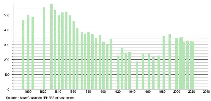 L'évolution du nombre d'habitants est connue à travers les recensements de la population effectués dans la commune depuis 1793. Pour les communes de moins de 10 000 habitants, une enquête de recensement portant sur toute la population est réalisée tous les cinq ans, les populations légales des années intermédiaires étant quant à elles estimées par interpolation ou extrapolation[17]. Pour la commune, le premier recensement exhaustif entrant dans le cadre du nouveau dispositif a été réalisé en 2004[18].