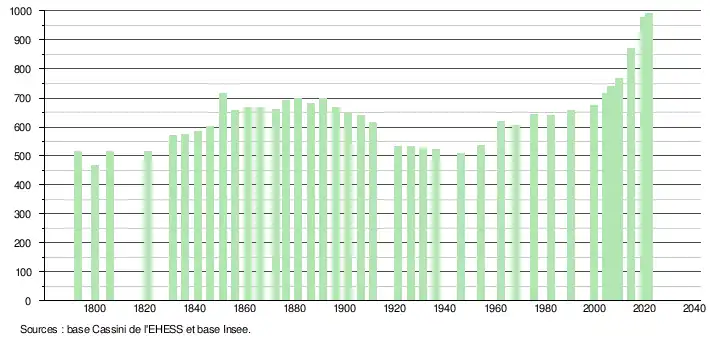 L'évolution du nombre d'habitants est connue à travers les recensements de la population effectués dans la commune depuis 1793. Pour les communes de moins de 10 000 habitants, une enquête de recensement portant sur toute la population est réalisée tous les cinq ans, les populations légales des années intermédiaires étant quant à elles estimées par interpolation ou extrapolation[17]. Pour la commune, le premier recensement exhaustif entrant dans le cadre du nouveau dispositif a été réalisé en 2004[18].