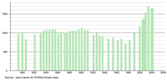 L'évolution du nombre d'habitants est connue à travers les recensements de la population effectués dans la commune depuis 1793. Pour les communes de moins de 10 000 habitants, une enquête de recensement portant sur toute la population est réalisée tous les cinq ans, les populations légales des années intermédiaires étant quant à elles estimées par interpolation ou extrapolation[23]. Pour la commune, le premier recensement exhaustif entrant dans le cadre du nouveau dispositif a été réalisé en 2004[24].