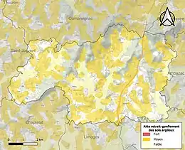 Le retrait-gonflement des sols argileux est susceptible d'engendrer des dommages importants aux bâtiments en cas d’alternance de périodes de sécheresse et de pluie[18]. 48,2 % de la superficie communale est en aléa moyen ou fort (27 % au niveau départemental et 48,5 % au niveau national métropolitain)[Carte 2]. Depuis le , en application de la loi ÉLAN, différentes contraintes s'imposent aux vendeurs, maîtres d'ouvrages ou constructeurs de biens situés dans une zone classée en aléa moyen ou fort[Note 4],[19].