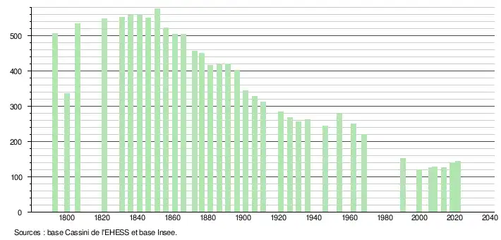 L'évolution du nombre d'habitants est connue à travers les recensements de la population effectués dans la commune depuis 1793. Pour les communes de moins de 10 000 habitants, une enquête de recensement portant sur toute la population est réalisée tous les cinq ans, les populations légales des années intermédiaires étant quant à elles estimées par interpolation ou extrapolation[14]. Pour la commune, le premier recensement exhaustif entrant dans le cadre du nouveau dispositif a été réalisé en 2008[15].