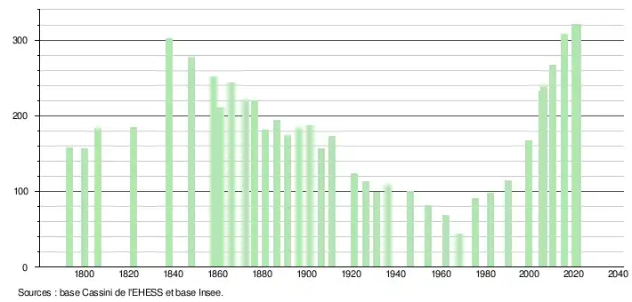 L'évolution du nombre d'habitants est connue à travers les recensements de la population effectués dans la commune depuis 1793. Pour les communes de moins de 10 000 habitants, une enquête de recensement portant sur toute la population est réalisée tous les cinq ans, les populations légales des années intermédiaires étant quant à elles estimées par interpolation ou extrapolation[8]. Pour la commune, le premier recensement exhaustif entrant dans le cadre du nouveau dispositif a été réalisé en 2005[9].