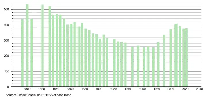 L'évolution du nombre d'habitants est connue à travers les recensements de la population effectués dans la commune depuis 1793. Pour les communes de moins de 10 000 habitants, une enquête de recensement portant sur toute la population est réalisée tous les cinq ans, les populations légales des années intermédiaires étant quant à elles estimées par interpolation ou extrapolation[22]. Pour la commune, le premier recensement exhaustif entrant dans le cadre du nouveau dispositif a été réalisé en 2007[23].