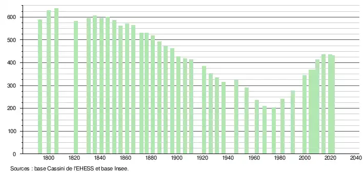 L'évolution du nombre d'habitants est connue à travers les recensements de la population effectués dans la commune depuis 1793. Pour les communes de moins de 10 000 habitants, une enquête de recensement portant sur toute la population est réalisée tous les cinq ans, les populations légales des années intermédiaires étant quant à elles estimées par interpolation ou extrapolation[13]. Pour la commune, le premier recensement exhaustif entrant dans le cadre du nouveau dispositif a été réalisé en 2004[14].