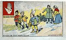 Un bonnet d'âne ou bonnet de cancre est un couvre-chef pointu muni ou non de deux appendices censés représenter les oreilles d'un âne. Interdit dans les écoles au XXIe siècle, il sert dès la fin du XVIIe siècle et jusqu'au début du XXe siècle, où son port peut être imposé comme punition par un instituteur à un élève indiscipliné ou présentant de mauvais résultats.
