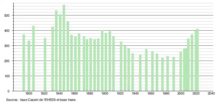 L'évolution du nombre d'habitants est connue à travers les recensements de la population effectués dans la commune depuis 1793. Pour les communes de moins de 10 000 habitants, une enquête de recensement portant sur toute la population est réalisée tous les cinq ans, les populations légales des années intermédiaires étant quant à elles estimées par interpolation ou extrapolation[19]. Pour la commune, le premier recensement exhaustif entrant dans le cadre du nouveau dispositif a été réalisé en 2004[20].