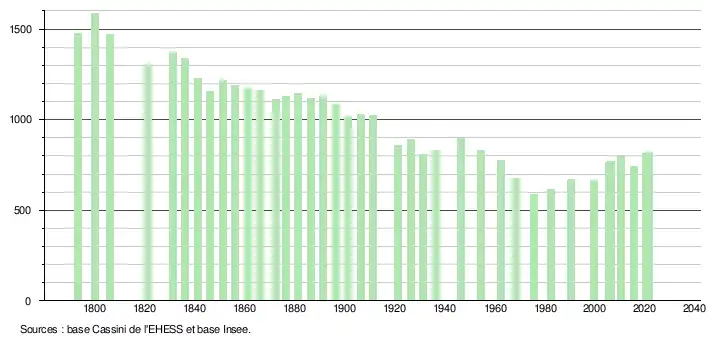 L'évolution du nombre d'habitants est connue à travers les recensements de la population effectués dans la commune depuis 1793. Pour les communes de moins de 10 000 habitants, une enquête de recensement portant sur toute la population est réalisée tous les cinq ans, les populations légales des années intermédiaires étant quant à elles estimées par interpolation ou extrapolation[20]. Pour la commune, le premier recensement exhaustif entrant dans le cadre du nouveau dispositif a été réalisé en 2005[21].