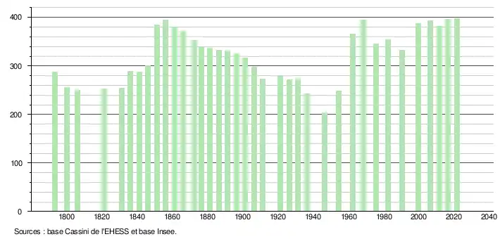 L'évolution du nombre d'habitants est connue à travers les recensements de la population effectués dans la commune depuis 1793. Pour les communes de moins de 10 000 habitants, une enquête de recensement portant sur toute la population est réalisée tous les cinq ans, les populations légales des années intermédiaires étant quant à elles estimées par interpolation ou extrapolation[28]. Pour la commune, le premier recensement exhaustif entrant dans le cadre du nouveau dispositif a été réalisé en 2006[29].