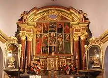 - retable de saint Antoine. Sur ce dernier on peut voir sainte Gertrude couverte de rats car elle était invoquée pour lutter contre l'invasion des rats ou qui pourrait être une expression votive contre la peste.