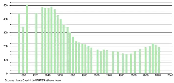 L'évolution du nombre d'habitants est connue à travers les recensements de la population effectués dans la commune depuis 1793. Pour les communes de moins de 10 000 habitants, une enquête de recensement portant sur toute la population est réalisée tous les cinq ans, les populations légales des années intermédiaires étant quant à elles estimées par interpolation ou extrapolation[32]. Pour la commune, le premier recensement exhaustif entrant dans le cadre du nouveau dispositif a été réalisé en 2006[33].