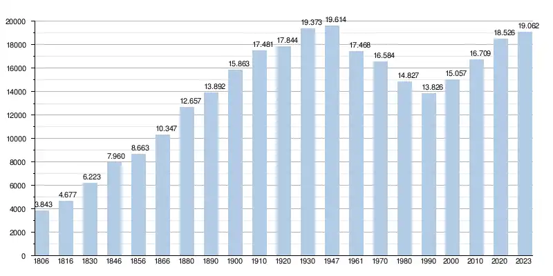- Source : DGS - Remarque: 1806 jusqu'à 1981=recensement; depuis 1990=nombre d'habitants chaque 1er janvier[5]