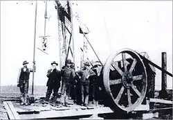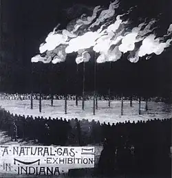 En 1886, le premier puits de gaz commercial de l'Indiana a été construit lorsque George W. Carter, William W. Worthington et Robert C. Bell ont engagé Almeron H. Crannell pour forer un autre puits à Eaton. Crannell a atteint le gaz à une profondeur de 922 pieds (281 m). Lorsque le gaz qui s'échappe est enflammé, la flamme atteint 10 pieds dans les airs. D'autres puits de gaz ont été forés, et dans certains cas, le gaz qui s'échappait a été enflammé pour annoncer la découverte, en supposant que le gaz était inépuisable. La flamme qui en résultait était appelée flambeaux[2].