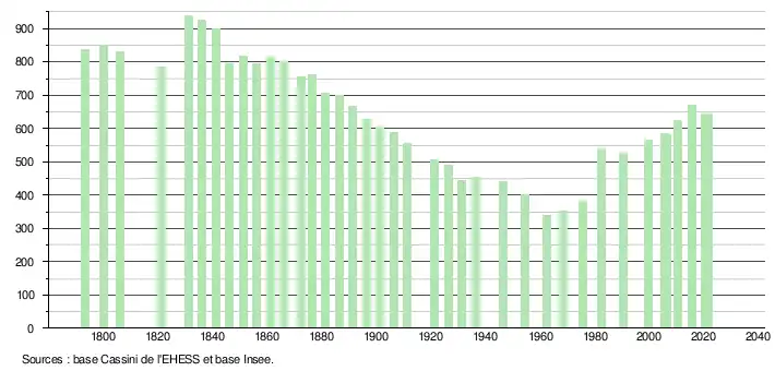 L'évolution du nombre d'habitants est connue à travers les recensements de la population effectués dans la commune depuis 1793. Pour les communes de moins de 10 000 habitants, une enquête de recensement portant sur toute la population est réalisée tous les cinq ans, les populations légales des années intermédiaires étant quant à elles estimées par interpolation ou extrapolation[22]. Pour la commune, le premier recensement exhaustif entrant dans le cadre du nouveau dispositif a été réalisé en 2005[23].