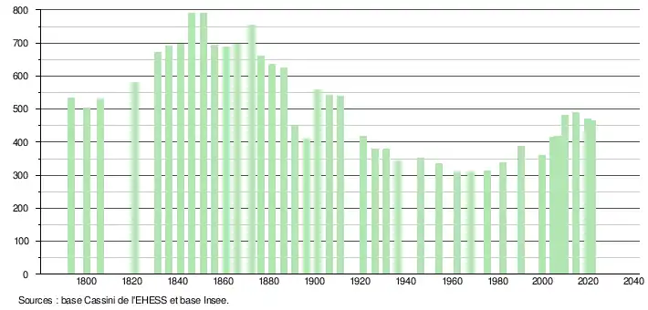 | L'évolution du nombre d'habitants est connue à travers les recensements de la population effectués dans la commune depuis 1793. Pour les communes de moins de 10 000 habitants, une enquête de recensement portant sur toute la population est réalisée tous les cinq ans, les populations légales des années intermédiaires étant quant à elles estimées par interpolation ou extrapolation[45]. Pour la commune, le premier recensement exhaustif entrant dans le cadre du nouveau dispositif a été réalisé en 2004[46]. En 2021, la commune comptait 465 habitants[Note 7], en diminution de 5,1 % par rapport à 2015 (Haute-Garonne : +7,43 %, France hors Mayotte : +1,84 %). |