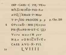 La différence est dans le nombre de « puissances tribunitaires », qui modifie la date de l'inscription mais seulement de un an tout au plus. Il y a aussi une différence de temps, l'un transcrivant un ablatif et l'autre un datif ; ce qui souligne la difficulté de lecture de l'inscription[13].