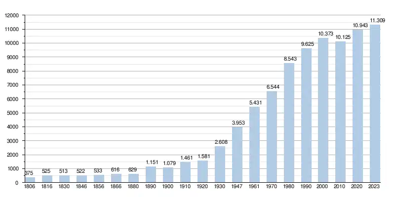 - Source : DGS - Remarque: 1806 jusqu'à 1981=recensement; depuis 1990=nombre d'habitants chaque 1er janvier[6]