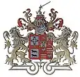 Blasonnement : Écartelé: 1. D'argent à une croix fleurdelisé vide de sable et à la bordure de gueules, chargée de 8 chaudrons d'or. 2. Écartelé a. et d. de gueules à un lévrier sautant d'argent b. et c. d'or à trois fers de moulin d'azur. 3. D'argent à deux loups placés l'un au dessus de l'autre de sable et à une bordure de gueules, chargée de sept croix de Saint André d'argent. 4. Écartelé a. et d. de gueules à une aigle d'argent b. et c. burellé de 6 pièces de gueules et d'or.