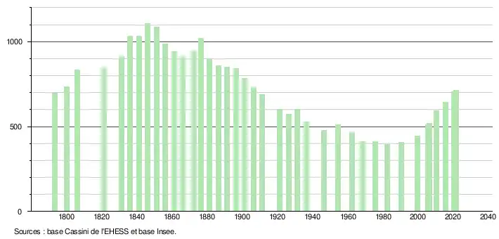 L'évolution du nombre d'habitants est connue à travers les recensements de la population effectués dans la commune depuis 1793. Pour les communes de moins de 10 000 habitants, une enquête de recensement portant sur toute la population est réalisée tous les cinq ans, les populations légales des années intermédiaires étant quant à elles estimées par interpolation ou extrapolation[18]. Pour la commune, le premier recensement exhaustif entrant dans le cadre du nouveau dispositif a été réalisé en 2005[19].