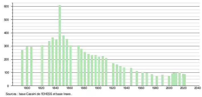 L'évolution du nombre d'habitants est connue à travers les recensements de la population effectués dans la commune depuis 1793. Pour les communes de moins de 10 000 habitants, une enquête de recensement portant sur toute la population est réalisée tous les cinq ans, les populations légales des années intermédiaires étant quant à elles estimées par interpolation ou extrapolation[16]. Pour la commune, le premier recensement exhaustif entrant dans le cadre du nouveau dispositif a été réalisé en 2004[17].