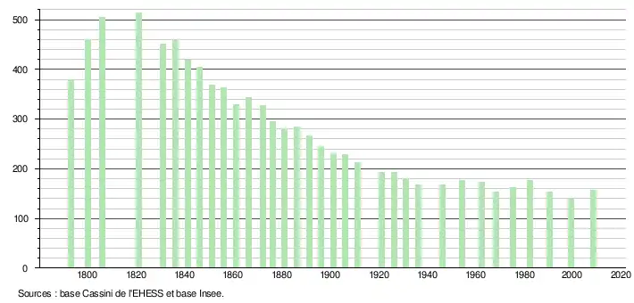 L'évolution du nombre d'habitants est connue à travers les recensements de la population effectués dans la commune depuis 1793. À partir du , les populations légales des communes sont publiées annuellement dans le cadre d'un recensement qui repose désormais sur une collecte d'information annuelle, concernant successivement tous les territoires communaux au cours d'une période de cinq ans. Pour les communes de moins de 10 000 habitants, une enquête de recensement portant sur toute la population est réalisée tous les cinq ans, les populations légales des années intermédiaires étant quant à elles estimées par interpolation ou extrapolation[8]. Pour la commune, le premier recensement exhaustif entrant dans le cadre du nouveau dispositif a été réalisé en 2008[9],[Note 1].