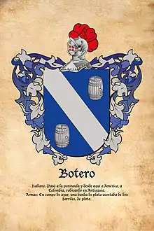 Le nom de famille Botero est un nom de famille d'origine italienne qui, avec d'autres noms similaires (Boter, Boteri, Botter, Botteri, Bottero)[1], est originaire de la région du Piémont en Italie[2].