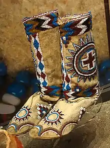 En Amérique du Nord, la botte apache, comme la botte mongole, existe en différentes formes communes. L'une d'elles comporte une extrémité des pieds relevée, mais celle-ci est face au gros orteil, et non centrée comme dans la version mongole[5]. L'autre est un mocassin à semelle plate.
