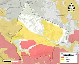 Le retrait-gonflement des sols argileux est susceptible d'engendrer des dommages importants aux bâtiments en cas d’alternance de périodes de sécheresse et de pluie. 61,7 % de la superficie communale est en aléa moyen ou fort (67,4 % au niveau départemental et 48,5 % au niveau national). Sur les 430 bâtiments dénombrés sur la commune en 2019, 353 sont en aléa moyen ou fort, soit 82 %, à comparer aux 81 % au niveau départemental et 54 % au niveau national. Une cartographie de l'exposition du territoire national au retrait gonflement des sols argileux est disponible sur le site du BRGM[22],[Carte 3].