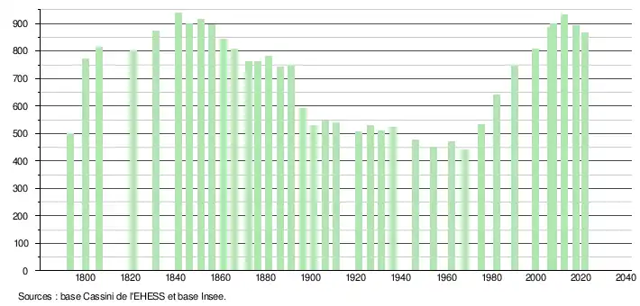 L'évolution du nombre d'habitants est connue à travers les recensements de la population effectués dans la commune depuis 1793. Pour les communes de moins de 10 000 habitants, une enquête de recensement portant sur toute la population est réalisée tous les cinq ans, les populations légales des années intermédiaires étant quant à elles estimées par interpolation ou extrapolation[35]. Pour la commune, le premier recensement exhaustif entrant dans le cadre du nouveau dispositif a été réalisé en 2007[36].