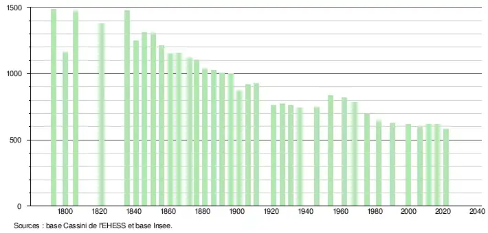 L'évolution du nombre d'habitants est connue à travers les recensements de la population effectués dans la commune depuis 1793. Pour les communes de moins de 10 000 habitants, une enquête de recensement portant sur toute la population est réalisée tous les cinq ans, les populations légales des années intermédiaires étant quant à elles estimées par interpolation ou extrapolation[28]. Pour la commune, le premier recensement exhaustif entrant dans le cadre du nouveau dispositif a été réalisé en 2006[29].