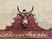 La devanture des boucheries était peinte en rouge sang. Jusqu'au début du XXe siècle, le boucher s'occupait aussi de l'abattage du bétail.