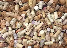 Bouchons en liège utilisés, avec marque de l'infiltration du vin le long de la bouteille.