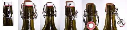 • d'un bouchon en céramique, plus rarement en verre coloré et de plus en plus souvent en polypropylène injecté, moins cher, moins fragile, moins perturbant pour le recyclage dans le verre perdu et qui n'occasionne pas les problèmes de migration de plomb dans la boisson que peut provoquer la céramique.