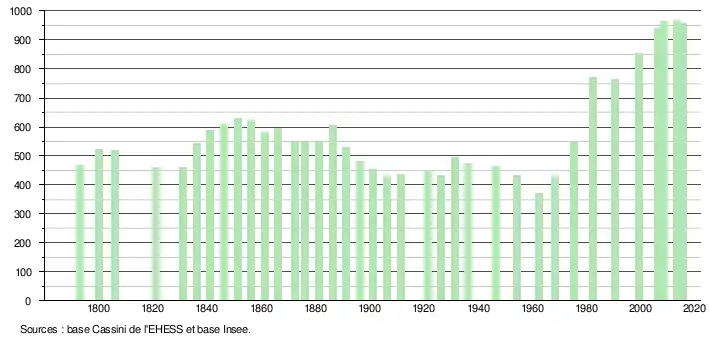 L'évolution du nombre d'habitants est connue à travers les recensements de la population effectués dans la commune depuis 1793. Pour les communes de moins de 10 000 habitants, une enquête de recensement portant sur toute la population est réalisée tous les cinq ans, les populations légales des années intermédiaires étant quant à elles estimées par interpolation ou extrapolation[5]. Pour la commune, le premier recensement exhaustif entrant dans le cadre du nouveau dispositif a été réalisé en 2008[6].
