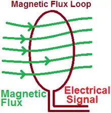 Une boucle de flux magnétique est une boucle de fil conducteur. Lorsque le champ magnétique qui traverse la boucle varie, il génère une tension par la loi d'induction de Faraday, générant un courant électrique. Celui-ci peut être mesuré, ce qui permet de déduire le flux magnétique. La tension induite est déterminée par[1] :