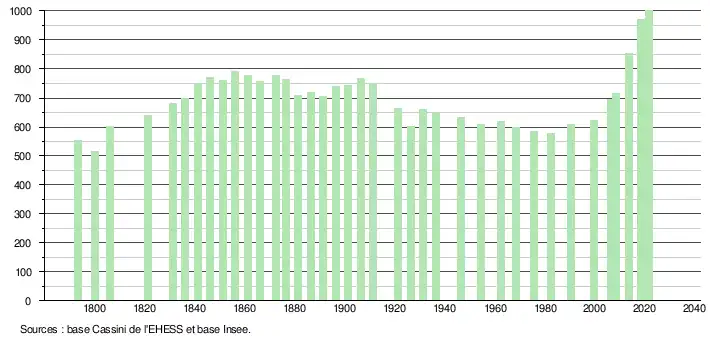 L'évolution du nombre d'habitants est connue à travers les recensements de la population effectués dans la commune depuis 1793. Pour les communes de moins de 10 000 habitants, une enquête de recensement portant sur toute la population est réalisée tous les cinq ans, les populations légales des années intermédiaires étant quant à elles estimées par interpolation ou extrapolation[25]. Pour la commune, le premier recensement exhaustif entrant dans le cadre du nouveau dispositif a été réalisé en 2008[26].
